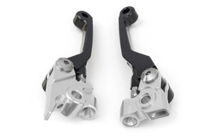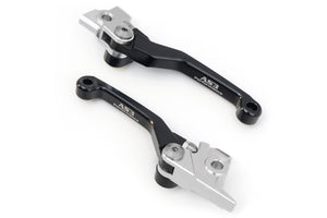 AS3 Performance flexible and adjustable front brake and clutch levers. Manufactured from high-strength aluminium, forged and then CNC machined to guarantee a long life service and a precise fit. The pivot design allows the levers to fold outwards on impact preventing them from breaking or bending. The levers are also have an adjustable reach allowing you to set them at a distance to suit the rider. Anodised in black with grey AS3 Performance logo for that factory look.