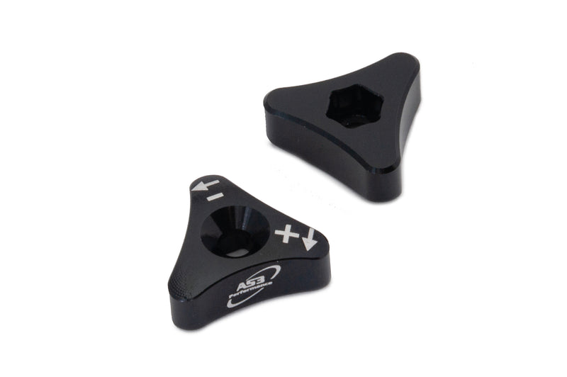 AS3 Performance front suspension fork adjusters are CNC machined from billet aluminium and are a stronger, more reliable upgrade to the plastic OEM fork adjusters. They have an anodised finish with AS3 Performance branding and lazer etched arrows showing + and - so that you know which way you are adjusting the compression.