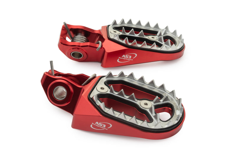 AS3 Performance Factory Series red foot pegs are CNC machined from 6061 billet aluminium and are fitted with stainless steel plates featuring 50 teeth to maintain a high level of grip and durability while keeping the overall weight of the foot pegs to a minimum. The Y shaped centre increases the overall strength of the foot pegs and the 55mm wide platform gives you a larger surface area for your boot than the OEM foot pegs.