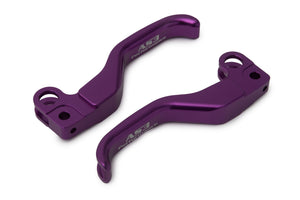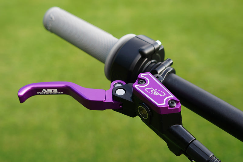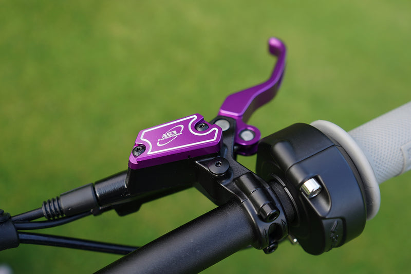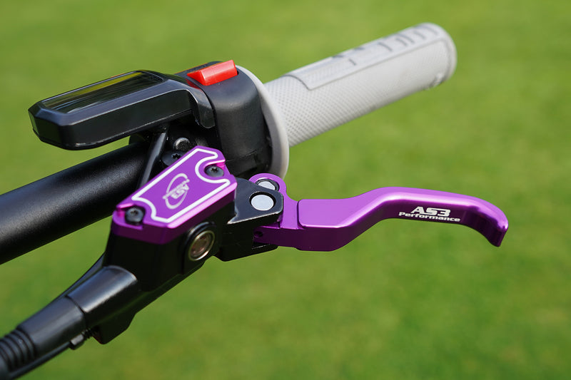 AS3 Performance front and rear brake levers for the Sur-Ron Light Bee are CNC machined from 6061 billet aluminium. They have a purple anodised finish with AS3 Performance branding on the front of each lever. They are designed to fit the standard master cylinders on the Sur-Ron Light Bee.