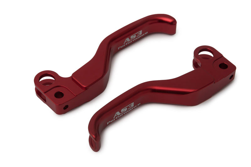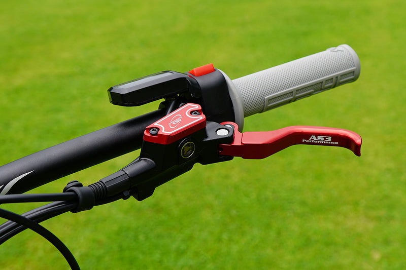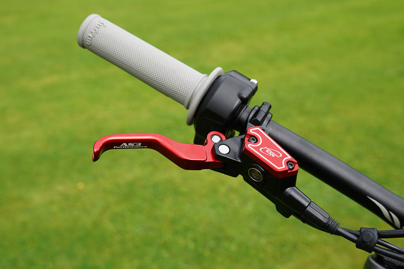 AS3 Performance front and rear brake levers for the Sur-Ron Light Bee are CNC machined from 6061 billet aluminium. They have a red anodised finish with AS3 Performance branding on the front of each lever. They are designed to fit the standard master cylinders on the Sur-Ron Light Bee.