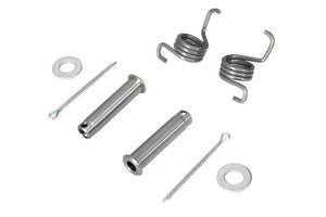 AS3 Performance 11mm oversized foot peg pins are purposely made 1mm thicker than the standard pins so that if the mounting holes in your foot pegs have worn and the pegs are now a loose fit you can simply drill the holes out slightly and fit these larger pins to give you a firm feel from the pegs again and reduce any unnecessary rattle or play. The pins are manufactured from stainless steel so will resist rust and corrosion and they come complete with springs and split pins as pictured.