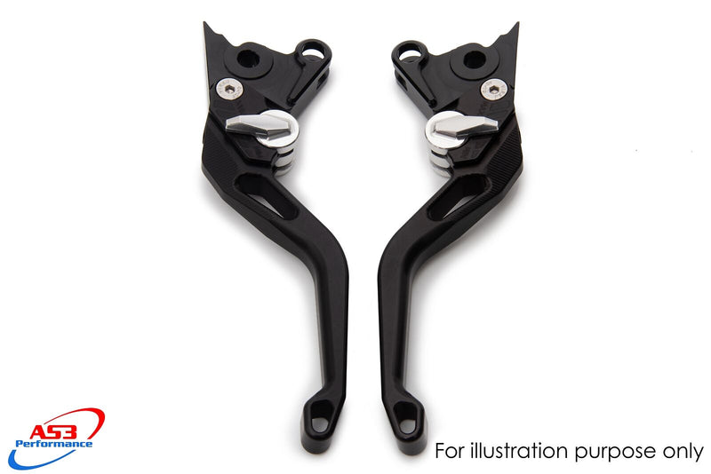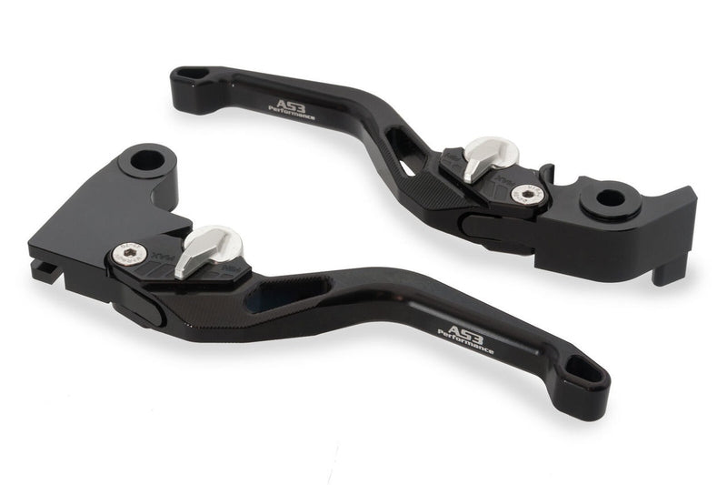 AS3 Performance adjustable front brake and clutch levers are available for a wide range of sports bikes, sports touring bikes and dual sport motorcycles. They are CNC machined from aircraft grade 6061 T6 aluminium and feature a short lever design to allow the rider to control the levers with either 2 or 3 fingers. The levers have 6 adjustable reach settings which can be easily set by using the silver adjuster. They come in a black anodised finish with AS3 Performance branding on the front of the levers.