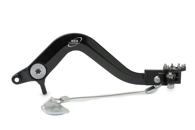 AS3 Performance rear brake pedals are cold forged from aluminium to improve the strength of the pedal while keeping the overall weight to a minimum. The forging process makes the brake pedal slightly softer than cast or CNC machined brake pedals which reduces the chances of it snapping on impact. They have a CNC machined spring loaded tip with 9 replaceable stainless steel teeth and come with a stainless steel brake snake cable which helps prevent the pedal bending if caught on deep ruts or rocks etc.