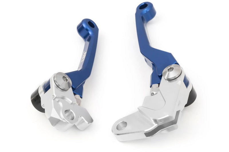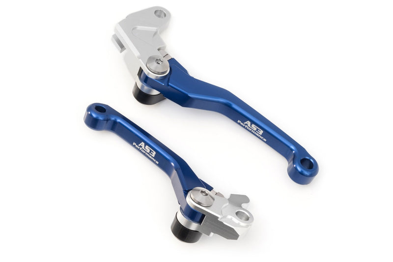 AS3 Performance flexible and adjustable front brake and clutch levers. Manufactured from high-strength aluminium, forged and then CNC machined to guarantee a long life service and a precise fit. The pivot design allows the levers to fold outwards on impact preventing them from breaking or bending. The levers are also have an adjustable reach allowing you to set them at a distance to suit the rider. Anodised in blue with grey AS3 Performance logo for that factory look.