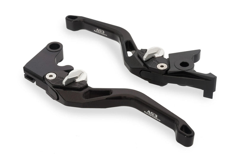 AS3 Performance adjustable front brake and clutch levers are available for a wide range of sports bikes, sports touring bikes and dual sport motorcycles. They are CNC machined from aircraft grade 6061 T6 aluminium and feature a short lever design to allow the rider to control the levers with either 2 or 3 fingers. The levers have 6 adjustable reach settings which can be easily set by using the silver adjuster. They come in a black anodised finish with AS3 Performance branding on the front of the levers.