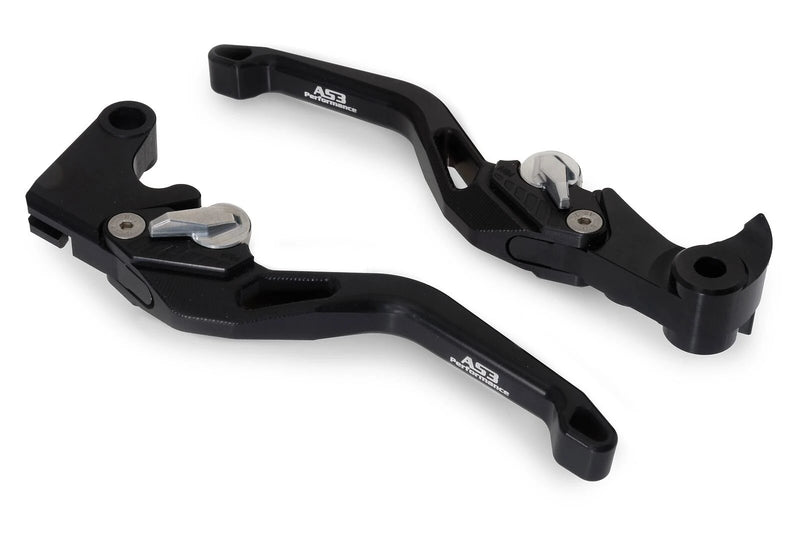AS3 Performance adjustable front brake and clutch levers are available for a wide range of sports bikes, sports touring bikes and dual sport motorcycles. They are CNC machined from aircraft grade 6061 T6 aluminium and feature a short lever design to allow the rider to control the levers with either 2 or 3 fingers. The levers have 6 adjustable reach settings which can be easily set by using the silver adjuster. They come in a black anodised finish with AS3 Performance branding on the front of the levers.