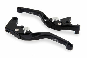 AS3 Performance adjustable front brake and clutch levers are available for a wide range of sports bikes, sports touring bikes and dual sport motorcycles. They are CNC machined from aircraft grade 6061 T6 aluminium and feature a short lever design to allow the rider to control the levers with either 2 or 3 fingers. The levers have 6 adjustable reach settings which can be easily set by using the silver adjuster. They come in a black anodised finish with AS3 Performance branding on the front of the levers.